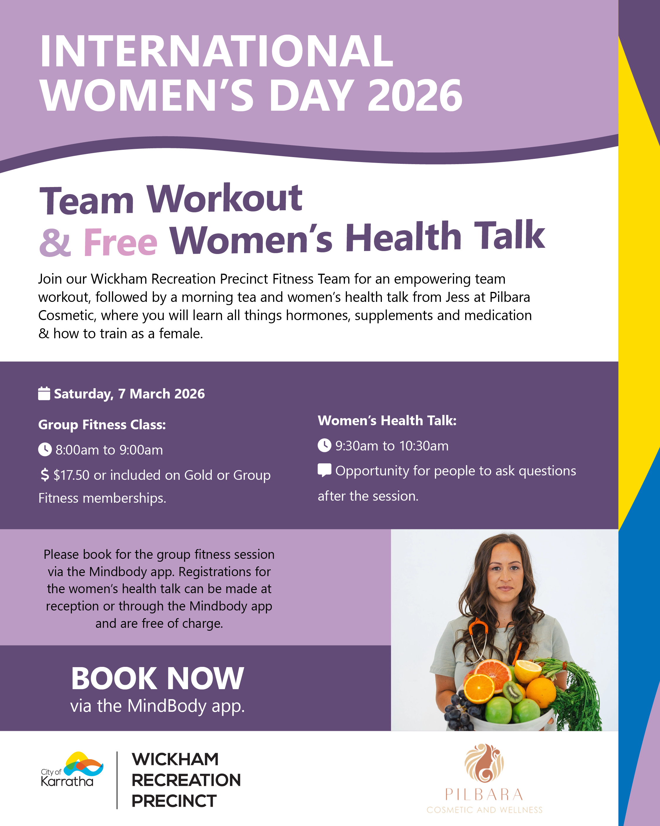 On Saturday, 7 March, the City of Karratha Fitness Team will lead a group fitness session, followed by a light morning tea, and a free health talk with Jess from Pilbara Cosmetic. Secure your spot today via the MindBody app.